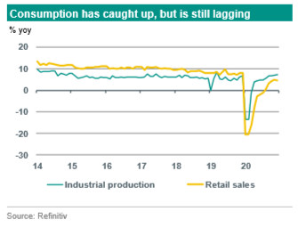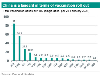 The downside of China’s success in keeping pandemic contagion in check is a lack of urgency on the vaccination front. Currently 2.8 vaccinations per 100 people (single dose) are reported for China. This is much lower than front runners Israel, UAE and UK, but also lower than some other key developed (e.g. US, Germany, France, Netherlands) and emerging economies (e.g. Turkey, Poland). China’s vaccination roll-out took off in mid December 2020, starting with key worker groups, followed by vulnerable segments before widening to all people over 60 years old. Beijing’s goal to have 50 million people inoculated before the LNY holiday has been extended to end-March, due to logistical issues as well as some hesitance within the population to get inoculated. All in all, China will likely reach herd immunity later than most other key economies, and may therefore be susceptible longer to potential virus flare-ups. Still, with China being ahead in terms of pandemic control and economic ‘normalisation’, success of the vaccination programme is most probably less of a ‘make or break factor’ for the overall macro outlook compared to most developed economies.