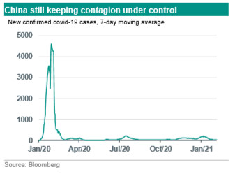 Getting the pandemic under control relatively quickly has been the crucial factor explaining China’s outperformance, being the only key economy posting positive annual growth last year (+2.3%), also see our China 2021 Outlook published last month. Obviously, China also experienced virus flare-ups, but so far these have been small and were met by quick and targeted measures keeping contagion in check. As a result, these flare-ups have not proven to be a real game changer in terms of the broad economic recovery to the same extent as in other key economies, although they have formed a drag on consumption growth. In late 2020/early 2021, China was faced with another round of flare-ups, with new confirmed covid-19 cases reaching a nine-month high of 342 on 22 January (still very low in an international context). The authorities have again reacted swiftly and decisively, by imposing new regional lockdowns (concentrated in the north east), re-tightening travel restrictions in the run-up to the Lunar New Year holiday and several rounds of mass testing. These measures seem to have worked well again, as the 7-day average of new daily cases has fallen from around 200 mid January to around 20 over the past few days.