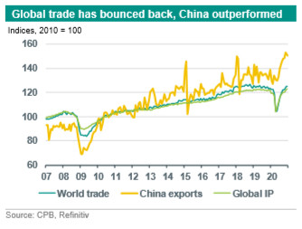 Since early 2020, developments in global trade and industrial production have been strongly shaped by the covid-19 pandemic. After collapsing by 16% in January-May 2020 during the first round of lockdowns, CPB’s global trade indicator has shown a sharp rebound (+20% in June- December). Annualized, following the covid-19 collapse, global trade growth turned positive again since November 2020 (December: +1.3% yoy). Thus, the rebound in global trade has extended into Q4-20 despite virus flare-ups and renewed lockdowns in large parts of the world, including Europe. This is in line with our view that the impact of this second round would primarily be felt in services and would be less harmful to global manufacturing and trade compared to the havoc to global supply chains created by the first round of lockdowns. Consistent with our global macro view, we expect the rebound in global trade to extend into 2021 and 2022, although with some hiccups at the start of this year (see below).