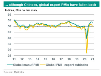 Chinese exports clearly outperformed global trade during the pandemic year 2020 (until November). Firstly, this reflects that – following the world’s first covid-19 lockdowns in early 2020 – Chinese firms were back to business quicker than their foreign competitors. Secondly, it reflects pandemic-related demand for medical supplies, computer related products, and other goods that can be bought online (sectors in which China has a competitive edge). Against this background, the recent slide in China’s (export) PMIs (and the related drop in the global PMI export subindex) is remarkable. Both China’s official PMI export subindex and its equivalent published by Caixin have fallen back to below the neutral 50 mark in recent months (February: 48.8 and 47.6, respectively). There are several explanations for this slide, such as the rising drags on the global economy from virus flare-ups, and the spread of new mutations and hence more restrictions. There are also seasonal factors such as the usual shutdown of Chinese factories during the Lunar New Year break. In addition, there is evidence that the outperformance of Chinese exports over the past year has caused logistical bottlenecks (see below). This may also help explaining why CPB’s export volume index for China fell back by three points in December 2020.