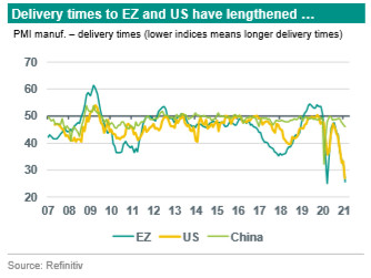To conclude, longer delivery times and a surge in freight rates point to bottlenecks in global goods transport. We assume that these bottlenecks will be mainly a temporary phenomenon that will be resolved in the course of this year, as pandemic disturbances will fade and supply and demand find a new equilibrium. However, these issues may cap the cyclical uptick in global trade in the first half of this year.