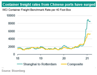 Over the past few months we have seen more signals of capacity constraints in global trade, illustrated by longer delivery times and a surge in freight rates. To start with the first factor, over the past few months, eurozone and US manufacturing PMIs point to a clear lengthening of delivery times. While a lengthening of delivery times is not unusual during cyclical rebounds, the extent to which these subindices have fallen suggest that there is more at play than just a cyclical correction. The drop in these indices for the US and the Eurozone is comparable to the ones seen during the first round of covid-19 lockdowns last year, and is larger than during the cyclical turnaround following the global financial crisis in 2007-08. Meanwhile, China’s manufacturing PMI surveys point to a much less dramatic lengthening in delivery times. This suggests that the capacity constraints are impacting trade flows from China/Asia to US/Europe more than trade flows from US/Europe to China/Asia.
