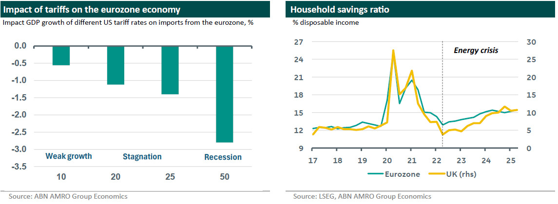 A 10% tariff – if sustained and if across all eurozone exports – would over time reduce eurozone GDP by 0.5% according to our calculations. However, it is worth noting that so far US tariffs have not been imposed on all products (with for instance pharma being an important exception). So, effective tariff rates have tended to be 2/3 of the headline rate. That would mean a GDP impact of around 0.3% and again assuming the tariff rate holds over the long term. While last year the EU took US tariffs on the chin, i.e. it did not retaliate, history may not repeat itself this time. Europe seems to have drawn a line with regards to Greenland and appears to be less open for appeasement. According to reports, EU leaders are preparing a package of tariffs affecting EUR 93bn of US imports and/or restricting US companies from the internal market under the anti-coercion instrument (ACI). This could give the EU leverage in future negotiations on Greenland, though it also risks a further escalation, with the US potentially raising tariffs further. Whether Europe continues to stand firm is a question mark.