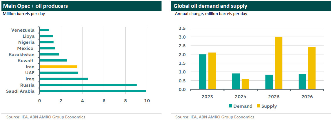 The widespread public protests in Iran against the regime, together with the possibility of US military intervention (a prospect that has recently receded) raised concerns recently about potential disruption to Iran’s oil supply. Iran is a significant producer (see chart below on the left), with supply of around 3.5 million barrels per day. It must be said that the starting point for the global oil market is very favourable (at least for consumers) with an ongoing supply glut expected this year, which should put downward pressure on prices. However, a scenario where Iran’s production was seriously disrupted could take the market closer to balance, or even one where demand exceeds supply, which could instead put upward pressure on prices.
