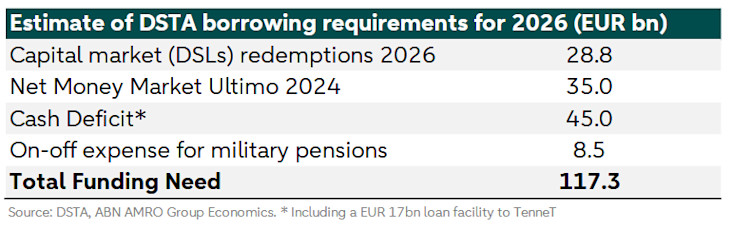 An important component of the financing requirement is the cash deficit, the expected difference between the Dutch government's revenue and expenditure. In recent years, the estimate of this deficit at the beginning of the year has always been far too pessimistic due to the aforementioned underspending of the budgets of various ministries in combination with higher than expected tax revenues. As a result, the DSTA had to revise downwards the financing requirement announced at the beginning of the year during the course of the year. As the government expects a higher budget deficit for this year and next, the cash deficit will also increase. For next year, this will mean that the cash deficit will be roughly the same as expected at the beginning of this year, resulting in a higher total financing requirement compared to this year, at around EUR 117bn (see table below).