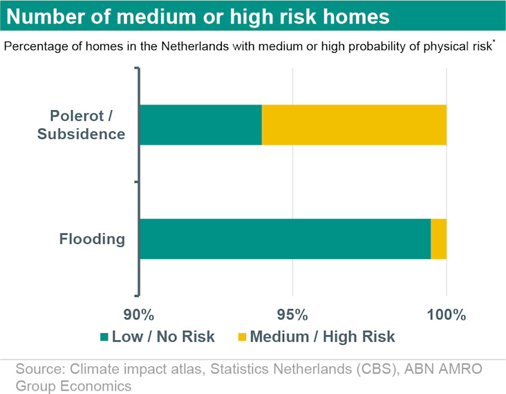 At the national level, based on the risk maps of Climate Impact Atlas and the National Water and Flood Information System (‘LIWE’), relatively few homes have a high to very high probability of physical climate risk*. The proportion of homes with medium or high risk ranges from about 0.5% for flooding to nearly 6% for pile rot and differential subsidence. The probability of a 50cm flood from water breaking through a flood defence is almost ten times lower than the probability of pile rot or differential subsidence. However, properties with a high risk of flooding, pile rot or differential subsidence could possibly suffer serious damage.