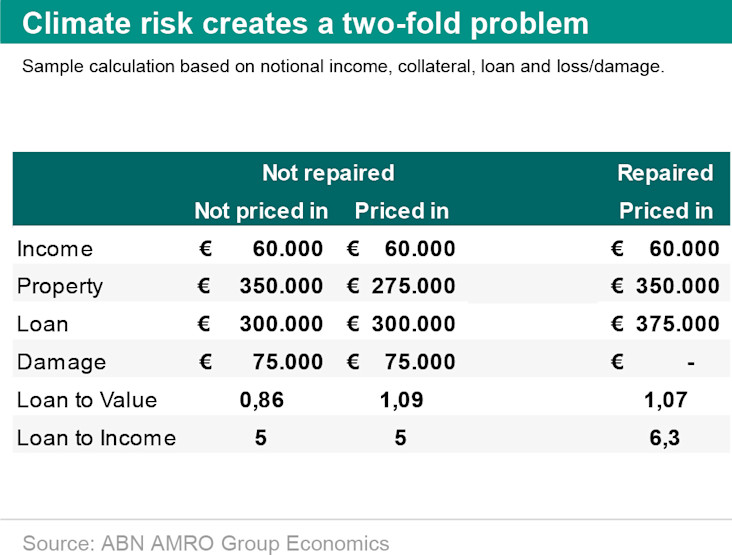 The table below shows the consequences when climate risk is not priced in. If the damage were to be fully priced in, the €350,000 house would drop €75,000 in value and the new value would be €275,000. As a result, the original loan becomes a lot higher than the value of the collateral, meaning the house now has negative equity. Repairing the damage could be paid for by increasing the mortgage. However, in addition to the negative equity problem, an ‘income problem’ may also arise. Due to insufficient income, the homeowner will be unable to raise the mortgage to finance the repairs, given that the monthly mortgage payments would then be too high. This could mean that the homeowner will be forced to sell the house.
