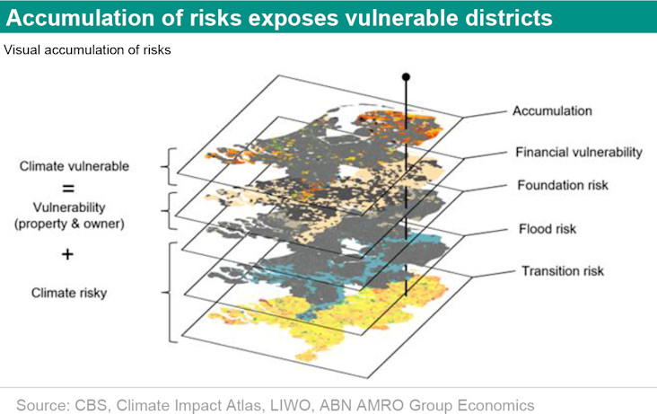 Besides the physical impacts of climate change, there is also the sustainability challenge. The question we focus on in this publication is: where in the Netherlands is the probability that homeowners will no longer be able to bear the costs of remaining resilient to both climate change and the sustainability challenge increasing? To this end, we analyse risk maps showing flood risks (primary and regional breaches), foundation risks (pile rot and differential subsidence) and sustainability risks, and the extent to which these problems play out in districts where properties and homeowners are vulnerable. By risks around climate change and sustainability, we mean the currently known probability of damage and costs between now and 2050. These costs arising from damage/loss and/or energy efficiency measures will either fall on current or future owners, depending on the extent to which those risks are already priced into residential property value today.