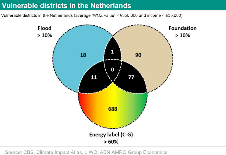 Finally, there are also districts where two or more risks accumulate. In most cases, this is the combination of a large number of houses with low energy labels and a high risk of flood or foundation damage.