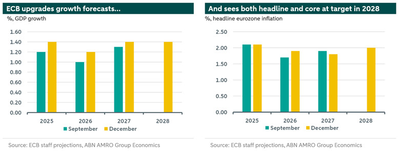 The ECB kept its key policy rates on hold as expected at the December Governing Council meeting. In the press conference following the decision, President Christine Lagarde repeated that the ECB was in a ‘good place’ with regards to interest rates, but also that this does not mean that the policy would be ‘static’. Indeed, the Council continued to signal that it would ‘follow a data-dependent and meeting-by-meeting approach to determining the appropriate monetary policy stance’. However, with economic growth revised up in the projections and inflation (especially stripping out energy prices) broadly seen on target, a rate change in either direction does not seem on the cards anytime soon, absent of a new shock. Indeed, we expect the ECB to keep its deposit rate at 2% in the coming months.