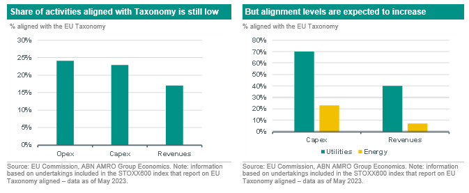 By evaluating the usability of the EU Taxonomy, the Commission has also reviewed (i) whether companies are making already use of the EU Taxonomy and voluntarily disclosing this information, and (ii) whether it can be used as a tool for the sustainability transition of these companies. On the first point, the Commission has evaluated that 63% of the companies included in the STOXX600 already report on EU Taxonomy alignment (which we assume have likely been included in the annual reports of 2022). By zooming-into this data, we see however that, on average, only a small percentage is fully aligned with the EU Taxonomy (see chart below on the left-hand side). However, the data also allows us to see that the share of aligned capital expenditures (capex) is slightly higher than the one for revenues. This allowed the Commission to also evaluate point (ii), as stated above. The data implies that companies are investing into EU Taxonomy aligned activities, but these investments are not yet translated into revenues. What is more, the Commission has also observed that a significant number of companies from high-emitting sectors (such as energy and utilities) have actually a very large share of capex in EU Taxonomy-aligned activities (see chart below on the right-hand side). Overall therefore, the Commission concludes that the “existing Taxonomy can effectively serve as a powerful signal for companies in transition.”