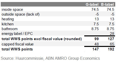 The table also shows that a capped fiscal value contribution is applied, since otherwise the currently high property price level in especially larger cities would give a significant boost in the number of WWS points. Hence, the fiscal value contribution to the number of WWS points can never exceed 33.3% of the total. When we hypothetically scrap this cap, the number of WWS points would have been 19 points higher in the case of the G-label, for example. This is currently unregulated, but would soon qualify as also middle-rent. On the other hand, due to a stronger number of points excluding the fiscal value contribution assigned to the B-label house, the effect of capping is also weakened and it only makes a difference of two points if the fiscal had been fully included (so with uncapped fiscal, the point count on the B-label property would be 194).