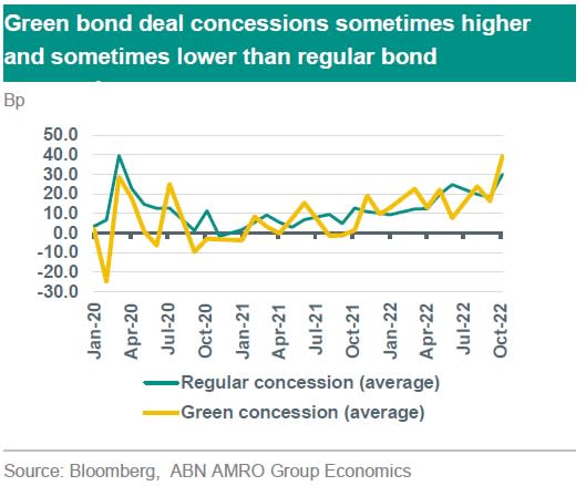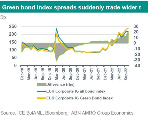 The new issue concession on corporate green bonds reached a multi-year high, despite green offerings having a similar credit quality of that of regular bonds. In secondary markets the green bond index suddenly trades at a wider credit spread than the regular index. Real estate credit makes up nearly 14% of the green bond index vs 7% of the regular corporate bond index. The dismal performance of real estate credit this year and the higher weight in the green bond index could therefore necessitate higher concession in primary deals to make up for poor performance on green bonds. A turn in the fortunes in real estate credit could drive new issue concession on all green bond deals down again.
