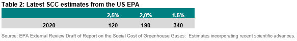 The US is currently using USD 51 which is essentially an inflation adjusted estimate of the SCC from the Obama administration. This estimate is based on a discount rate of 3%. The US Environment Protection Agency (EPA) published a revised estimate of the SCC which is dramatically higher. The new estimate, which is still in proposal stage, is centred at USD 190 at a discount rate of 2%. As before, the estimate is highly sensitive to the discount rate that is assumed in the calculations (see table below).