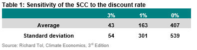 The table shows that the average estimate of the SCC stands at USD 43 at a 3% discount rate and nearly 9 times bigger at USD 407 at a 0% discount rate. The dispersion or the uncertainty around this estimate, as measured by the standard deviation, widens as the discount rate falls. Intuitively that reflects the fact that we know the future less well than the present and that a lower discount rate places a greater weight on future values.