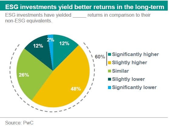 A PwC survey (see ) has shown that 60% of investors said they record higher returns on their ESG investments compared to non-ESG ones, and only 14% mentioned they actually had a negative impact on returns. Also more than half has mentioned it took less than 3 years for these better returns to materialize. We therefore do not believe that the perceived negative impact on returns should be seen as a real barrier to implement ESG strategies. While investments returns may be impacted by market nuisances in the short-term, in the long-term, those tend to yield better returns.