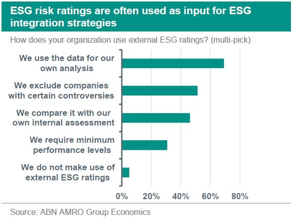 In terms of data used for ESG incorporation, Morningstar’s survey shows that most of the respondents use proxy advisors (32%), which matches with the fact that a lot of investors use stewardship as ESG strategies. However, the survey also shows that investors use ESG data providers (29%), investment consultants (28%) and ESG rating providers (28%). These can be applied for either screening policies (for example, by directly excluding a company that does not satisfy a certain ESG risk rating) or for ESG integration, where the data provided by external sources can be, for example, integrated into materiality assessment and/or ESG scorecards. We think the latter is usually the case, not only because we previously demonstrated that ESG integration is more frequently used than screening as an investment strategy, but also because our own survey has previously indicated that the majority of investors use ESG risk ratings for their own analysis, rather than as a “blind” input.