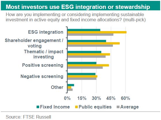 We now take a closer look at how investors are currently integrating ESG into investment decisions. The FTSE Russell survey indicates that for Fixed Income investors, the most common ESG strategies pursued are (i) stewardship (40%), which involves actively engaging with the company in order to drive positive changes related to ESG, and (ii) the thematic / impact investing (35%). Within equities, however, most investors integrate ESG in the form of (i) ESG integration (61%), which involves incorporating material ESG factors (risks and opportunities) that are likely to affect a company’s operation and performance into traditional fundamental analysis, and (ii) stewardship (54%). Overall, therefore, we can say that on average the mostly used strategies are ESG integration and stewardship.