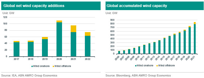 Europe is considered abundant in wind power. Under the REPowerEU plan, the European Union aims to reach a renewables share of 39% of the European electricity mix by 2030. This target was further raised to 42.5% in May 2023. To reach this goal wind power capacity is envisioned to increase by 129 GW for the EU over the 2023-2027 period, added to the current 255 GW already installed. Globally, and according to the Global Wind Energy Council (GWEC), wind capacity reached 906 GW by the end of 2022, with a year to year growth of 9%. GWEC further forecast new capacity additions of 680 GW over the 2023-2027 period. Accordingly, wind power has an essential role to play in the energy transition. The subsequent section dives into the trends in wind power and main drivers for wind investments.