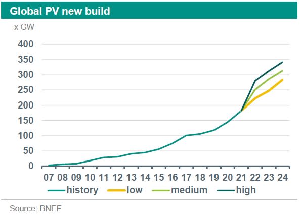 The installed capacity of solar PV increased again by around 20% in 2021, similar to the growth in 2020 according to SolarPower Europe. This brings the installed capacity of solar at 167.8 GW in 2021. For PV growth during the coming years, BNEF provides three scenario’s (see graph below). In the low case, the current growth of global PV new build will continue to grow at a similar pace. However, in a high case, a strong acceleration can be expected in the coming years. With European politicians searching for the Russian gas dependence (see article in the Sustainaweekly of 10 October) and other global policy initiatives, we judge that the investments in solar and will get an extra boost, which makes the medium or even the high case more likely. In the mid-scenario, BNEF expects new-build PV to rise to 460 GW annually in 2030.