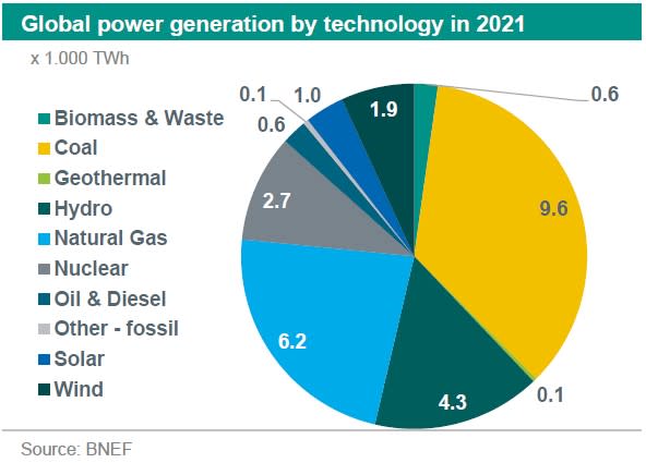 The share of coal in the mix has declined to 35% from around 40% a decade ago. But recent developments have halted this trend. In fact, the contribution to the electricity mix of coal and natural gas remained relatively stable in the last three years (respectively 35% and 23%). A trend that has continued is the rise of renewable energy, especially solar and wind. In 2021, with a level of nearly 3.000 TWh, wind and solar accounted for a combined 10.5% of the global power generation according to a Bloomberg New Energy Finance (BNEF) trend report.