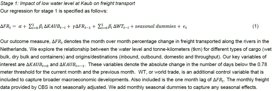 Our empirical analysis is split into two stages. In stage one, we explore the impact that the low water level, as measured at Kaub, has on freight that is transported along the Rhine in the Netherlands. In the second stage, we estimate the impact of low water levels on industrial production and construction in the Netherlands.