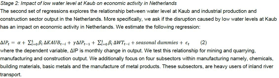 Again, the full set of results is available in the longer version of this note. In short, episodes of low water levels at Kaub do not have a significant impact on economic output. In other words, the industrial output in Netherlands is largely unaffected by developments on the Rhine at Kaub. This is the case for the major industrial groups as well as the four manufacturing sub-sectors. The second stage results are also consistent with our finding that the volume of domestic freight transport within Netherlands is immune to developments on the Rhine in Kaub.