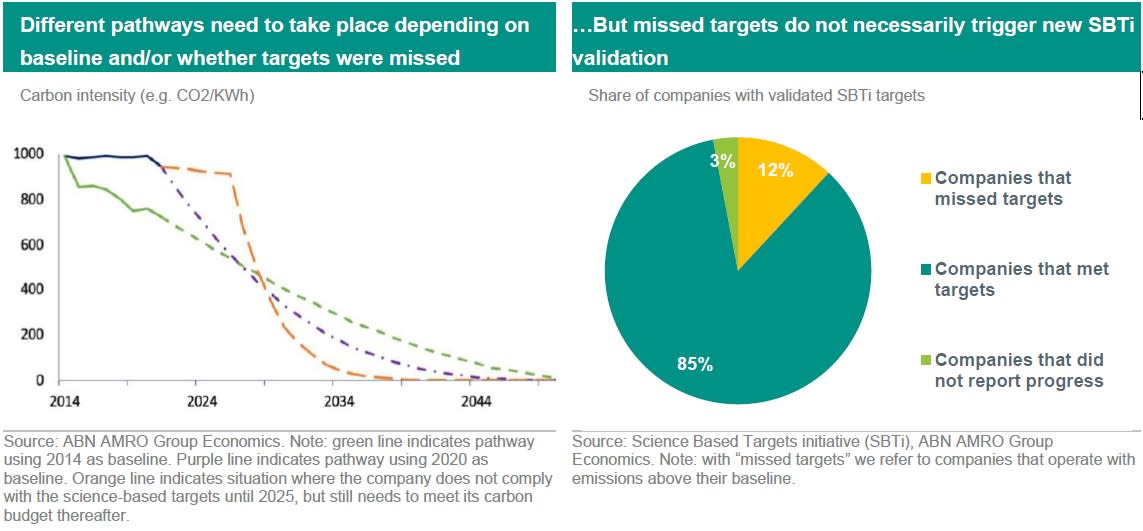 Pathways re-calculated in case a target is missed necessarily rely on a faster decarbonization pace. The chart below on the left hand side (extracted from the paper of Rekker et al.) exemplifies how different pathways can take place depending on baseline year (blue line uses baseline year as 2020, while green line uses baseline year as 2014) and as well whether targets are missed or not (exemplified by the orange line). In both cases (missed targets and/or later baseline year) companies are required to speed up their decarbonization process in order to meet their carbon budgets, and this can be a highly disruptive process for the company, forcing them to accelerate the retirement of carbon-intensive assets and more rapidly mobilise capital to low-carbon assets. Hence, this faster transition can also have an impact on a company’s financial health, which is why it is so important for investors to not only focus on end goal targets (e.g. carbon neutrality by 2050) but to rather also do annual checks on whether companies decarbonize according to science-based decarbonization pathways.