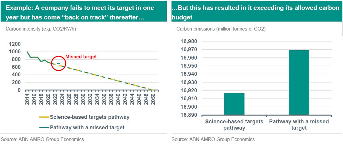 To make our point more clear, we would like to give a figurative example as shown below. Given that a company has only a limited carbon budget it can spend, if a company exceeds its budget within a certain year, it consequently needs to overcompensate in the years thereafter. So that means, more than exclusively looking at achieving a certain target within a certain year (e.g. carbon neutrality by 2050), this company needs to decarbonize at a faster pace thereafter in case it missed its targets within a certain year. The chart below on the right hand side shows a situation in which a company has within a certain year failed to meet its targets. Nevertheless, the following year, it has compensated and managed to be “back on track”. Ultimately, it has reached its initial carbon neutrality target by 2050. However, this resulted in it exceeding its carbon budget (see chart on the right hand side), which means that its initial decarbonization path was no longer compliant with the Paris Agreement.