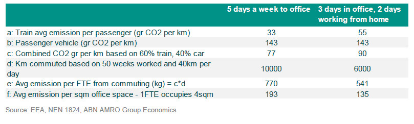 These intensities allow us to calculate a weighted average for commuting to the office, and for simplicity we assume a 60/40 split in travel between train and car and that the commute is 40km daily both ways. Given that the train will continue to drive according to schedule despite workers staying at home, we increase the average intensity for trains by a factor of 1.67 to account for lower occupancy (this is quite conservative as it assumes all train passengers have office as their destination). Next to the 18kg saved per sqm from less total space needed, the 4000 km spent less on commuting reduces emissions by an additional 58kg per sqm per annum.