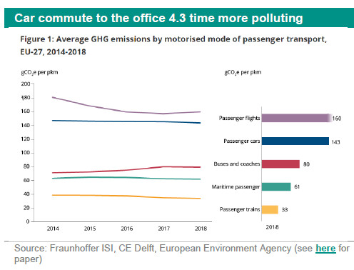 Next up is employee commuting, where the savings in emissions tend to be much bigger. An old Eurostat study from 2017 highlighted that in the larger cities, where we would expect the bulk of offices to be present, roughly 60% of commuting is via public transport. A 2018 paper by the EEA shows that train travel emits 33 grams of CO2 per km, while travel by car emits 4.3 times more.