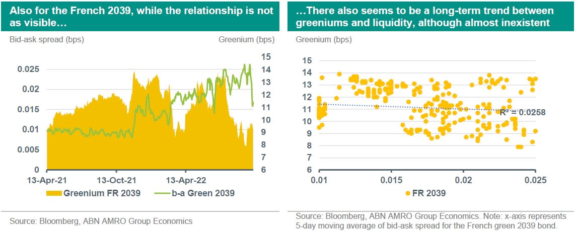 Following our findings that the greenium for Germany is partly driven by liquidity (that is, less liquidity resulting in lower greeniums), we have tried to validate whether this could also be a driver for semi-core EU sovereigns, such as France and Belgium.