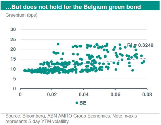 Interestingly, however, this does not hold for the Belgium green bond. In fact, the relationship between volatility and greenium is actually the opposite in this case. That is – the higher the volatility, also the higher the greenium. And that seems to be supportive with the fact that the Belgium greenium has been on the rise since the de-coupling in sovereign greeniums started to take place at the start of this year (see chart on page 2). While all other sovereigns (Germany, France, and the Netherlands) saw their greenium decrease over the past few months, the opposite seems to be true for Belgium. A potential reason for that is the fact that the Belgium green bond has a lower maturity (2033) than the Dutch (2040) and the French (2039 and 2044) green bonds. Hence, as it is with the 2025 German green bond, it could be that the lower duration of the bond plays a role. However, given the lack of historical data over green bonds in Belgium’s curve, it is at this point however not possible to test this hypothesis.