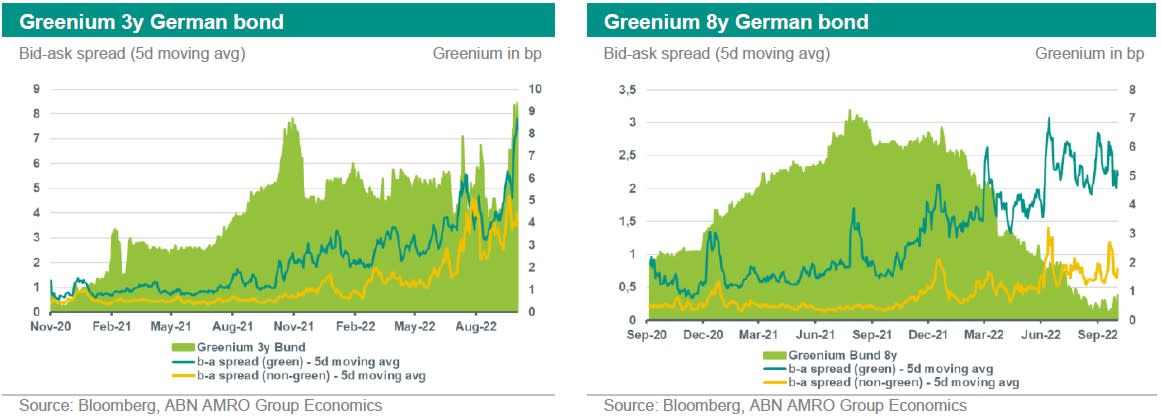 The 3y German government bond seems to be the exception to the rule. This seems related to the recent shortage of collateral of short-dated high-quality bonds, which seems to have hit the non-green bond the most. As a result, the 3y Bund greenium is now trading above 9bp, which is significantly higher than the average greenium of 4bp across all other green bonds. It has also made the 3y greenium the most volatile, as shown in the graph below.