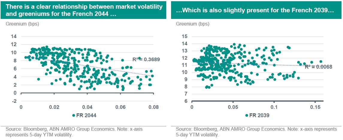 We now turn to volatility as explanatory factor for greenium of sovereigns. This was calculated by taking into account the 5-day variance between yields to maturity. As shown in the charts below, there is a clear relationship between realized volatility and greeniums for the French 2044. In this case, we can see that the higher the volatility, the lower the greenium. One explanation could be that once the market is in distress, and there is more volatility in yields, investors become less distinctive between green and non-green bonds, and this results in a lower greenium. That is, investors are less willing to accept a lower price for a green bond. Nevertheless, we would like to highlight that even under these conditions, the greenium still seems to be present. This relationship also holds for the French 2039 bond, although again, not as firmly as with the French 2044, as evidenced by the lower R-square.