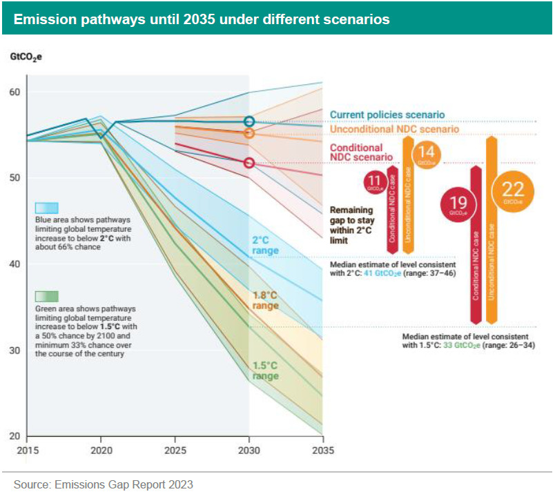 COP28 picks up where COP27, held in November 2022, left off. We concluded last year () that limited progress was made in the fields of the outlook for global warming and the important specific issue of climate finance for developing countries. While the ambitions were reiterated, there were some concrete commitments lacking. Examples mentioned by Alok Sharma, President of COP27, include no mention in the concluding text of peaking emissions of 2025; follow-through on the phase-down of coal; and the phasedown of fossil fuels generally. The outlook for global warming under different assumptions did not change significantly at COP27 compared to COP26. This reflects that there have been limited updates of country’s emission reduction plans (Nationally Determined Contributions, NDCs) in the run up to or during the climate summit.