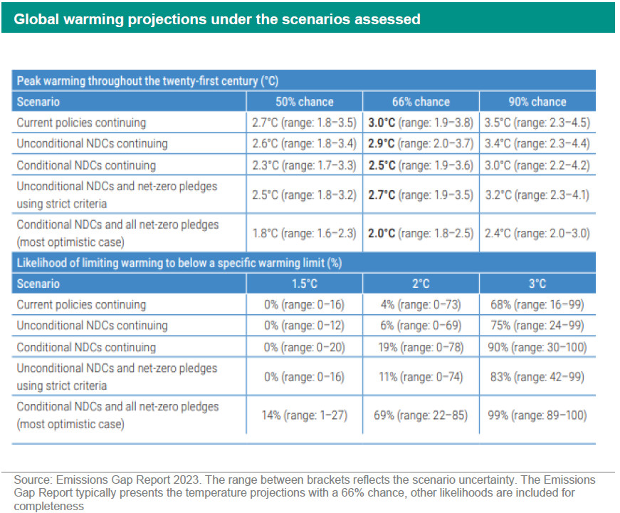 According to the Emissions Gap Report, the current policies to reduce GHG emissions make the world likely to warm around 3°C by the end of this century. Delivering on all unconditional and conditional pledges by 2030 lowers this estimate to 2.5°C, with the additional fulfilment of all net-zero pledges bringing it to 2°C. Even in the most scenario the likelihood of limiting warming by 1.5°C is only 14%.