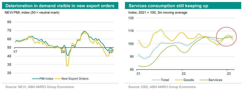 Meanwhile, headline inflationary pressure is easing, but core inflation is likely to stay somewhat elevated. The NEVI PMI for March showed that the majority of firms in the panel said input prices have decreased (to 46.4 which is below the neutral 50 mark) and suppliers‘ delivery times became shorter. This creates downward pressure on prices. Although headline inflation is pushed down by energy base effects, the broadening of (core) inflation is expected to continue well into 2023.