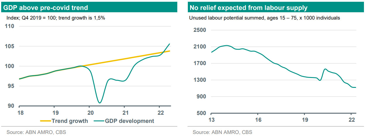 Last week’s Q2 GDP data yielded an upward surprise. Quarterly growth was expected to be positive, but only marginally. Instead, qoq GDP growth came out at a whopping 2.6%. This pushed the level of GDP even above the pre-Covid trend level (see left figure). All subcomponents surprised to the upside, but investment (+5.2% qoq) and exports (+2.7% qoq) stood out in particular. For investment this was a welcome catch-up after it had been lagging GDP growth since mid-2021 when supply bottlenecks intensified. Investment in transport equipment was a particularly strong driver. Exports were driven by a further catch-up in services exports, partially on a return of tourists to the Netherlands, but strength was also visible in machinery and chemicals. Due to Covid-induced economic volatility, the difference between first and final official GDP estimates have been significant in recent quarters. The initial GDP estimate could therefore be revised downwards in future.