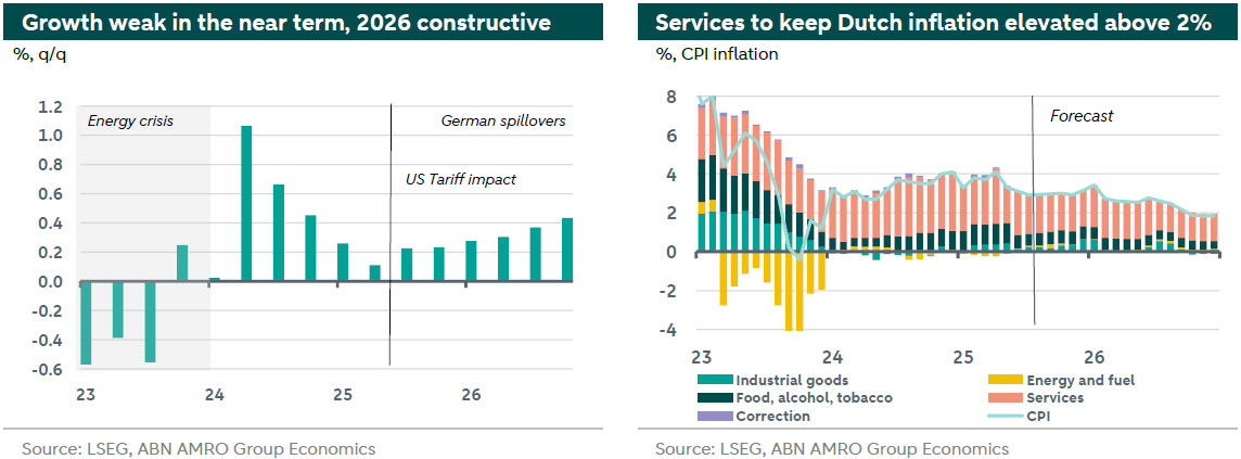 Q2 GDP came in at 0.1% q/q, roughly in line with our expectations (0.2% q/q), leading to small tweaks to our annual forecast of 1.5% in 2025 (from 1.6%) and 1.1% in 2026 (from 1.3%). Tariffs will weigh on activity in the near term, directly and indirectly via main trading partners. 2026 growth benefits from rate cuts, solid demand and fiscal spending in main trading partner Germany. After summer, it is all eyes on the Hague, with the caretaker government presenting the 2026 budget, and the election campaign ahead of the 29 October elections.