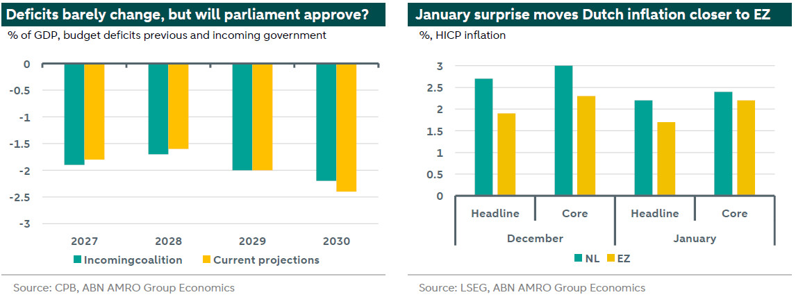 As expected, the election-winning liberal-progressive D66, the centre-right VVD, and the Christian Democratic CDA have reached an agreement to form a minority government. On the 30th of January the three parties presented their coalition agreement. Central in the government’s plans is the ramping up of defence spending to adhere to the new NATO-target. The incoming government plans spending increases from roughly 2% of GDP now, to 2.8% by 2030 and 3.5% by 2035. This goal is ambitious, particularly when it comes to defence personnel given the very tight labour market. Most of the other measures are designed to support this goal. Spending cuts, particularly in healthcare and social security (cutting unemployment benefits from two to one year), along with higher income taxes, are intended to finance these investments. As a result, as shown by CPB calculations, budget deficits and debt to GDP ratios in the next 4 years are only marginally higher compared to previous policies.