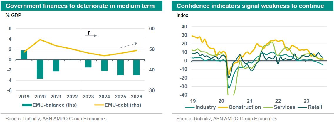 The macro impact of the budget is limited. Redistributive policies do boost the purchasing power of lower income households, which will support private consumption in 2024, but is likely not enough for us to raise our GDP forecast of 1.1%. In the near term, we expect growth to remain roughly stagnant in the third quarter before it picks up slightly in the fourth quarter on the back of household spending. Sectoral confidence indicators point to a broad slowing in economic activity. Industry is the outlier and in clear recession. The return to growth will therefore be driven by private consumption, as wage growth and the one-off energy allowance – which past experience suggests will drive a short term boost in spending – will lift private consumption in the fourth quarter. In 2023, the Dutch economy is expected to grow by 0.5%.