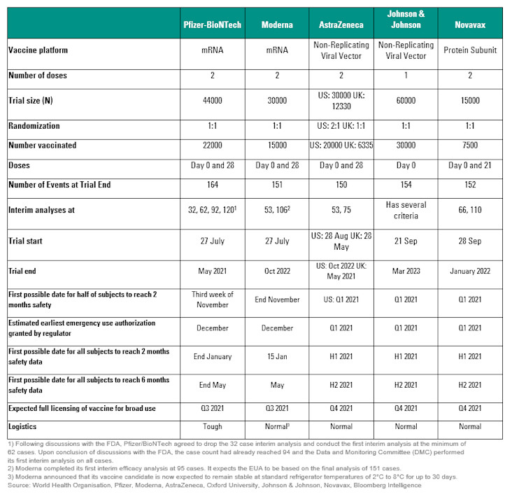 The Pfizer/BioNTech and Moderna vaccines will likely be granted emergency use authorisation in the US and Europe in the back half of December or early next year. The UK trial of AstraZeneca was the first to begin Phase 3 studies already back in May, and despite being setback temporarily by a pause, could be granted a conditional marketing approval in Europe early next year, and probably earlier in the UK. Data from the Johnson & Johnson and AstraZeneca US trials should be available sometime in Q1 2021 and emergency use authorisation granted shortly thereafter. The Novavax vaccine candidate is currently conducting a Phase 3 study in the UK and will start their larger US study any day now. Novavax could be granted an emergency use license in the first half of 2021.