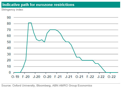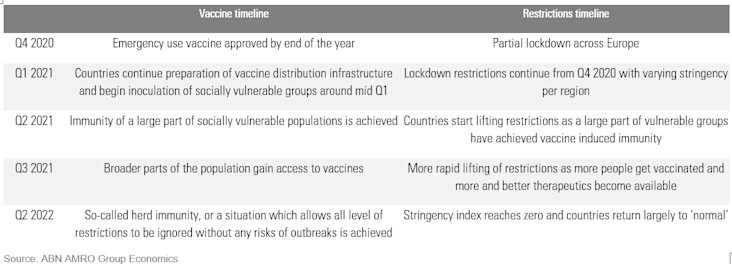The rollout of an effective vaccine to the vulnerable and key workers will coincide with a significant lifting of restrictions in Q2 of next year and especially Q3. Better and faster COVID-19 testing mechanisms, as well as therapeutics will also help further unwound restrictions. This will trigger rapid economic growth in both Europe and the US from around Q2 onwards. See below for an indicative path for eurozone restrictions: