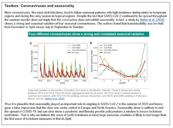 Stemming from this narrative, we expect lockdowns in Europe to ease gradually starting in the end of Q1 2021 with a more rapid lifting of restrictions in Q2 and especially Q3. Still, some minimal level of stringency measures to remain for the entirety of 2021. Focusing on the near term, we expect the current (soft) lockdown measures which are in place in most major eurozone economies to remain in place for a longer period than in the first wave of lockdowns in March-April primarily due to seasonality patterns common to coronaviruses, as well as governments wanting to avoid potential third waves of virus infections.