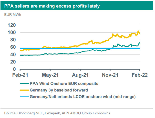 However, since all renewable PPA sellers will be confronted with higher costs, we expect them to collectively raise the bar for a higher PPA price. Also, these price rises should not result in wind power becoming suddenly less competitive vs fossil fuels, since the chart on the previous page showed that there’s also roughly 100% headroom before for example onshore wind power LCOE becomes less competitive against gas power LCOE. In case there’s equivalence between gas powered electricity LCOE and onshore wind electricity LCOE, after onshore wind energy LCOE has incorporated the effects of higher raw materials, buyers will still opt for the latter given the zero carbon emissions associated with renewable electricity. Furthermore, PPA buyers are also taking into consideration the day-by-day surge in power prices, which makes them eager to engage in long-term contracts to achieve stability in costs. Finally, we note that potential PPA sellers have an alternative to directly sell the power in wholesale market to capture the existing high price levels. This will obviously create scarcity for PPA buyers, hence giving them less buying power. Overall, we think that there’s more upside than downside risk in renewable energy PPA’s this year.
