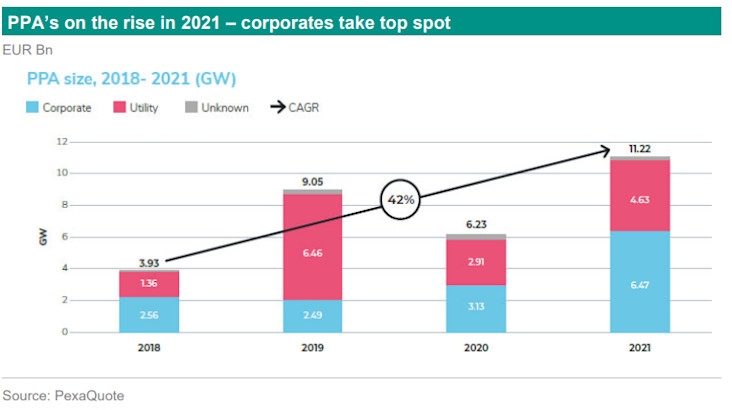 The market for PPA’s has grown significantly over the years. In a PPA market outlook note published by Pexapark recently, they found that over 11GW was contracted across Europe in 2021, showcasing a compounded growth rate of 42% over the last four years. A volatile power price environment at the end of last year kept utility off-takers on the side lines as the PPA is a long-dated instrument, while utilities sell the purchased power in the more liquid short dated markets. This short-dated power market experienced an immense spike in volatility, which pushed many of these utility contracts significantly out of the money and required them to post huge margin calls. However, the further ascent of corporates in the PPA space completely outweighed the lower purchases by utilities. Especially large energy-hungry corporates operating in the data and industrial space were eager to enter contracts in 2021, resulting in over a doubling of contracted power versus a year ago.