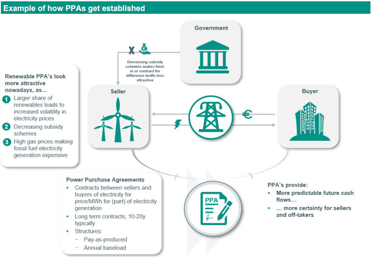 To mitigate the effects from the less generous subsidies and potential fierce price competition on the wholesale markets, renewable electricity providers are increasingly using Power Purchase Agreements (PPA’s) to ensure long-terms stability in their earnings, besides production risks due to unforeseen weather patterns. In this contribution, we explain what PPA’s are and what is driving the existing dynamics in the PPA market.