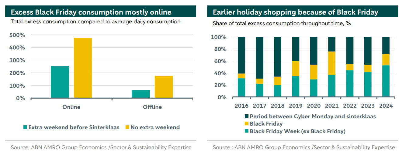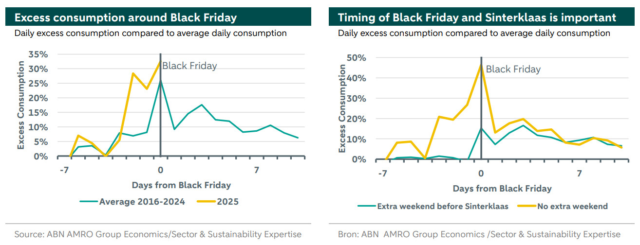 When Black Friday falls late in November, this has two key effects. First, the average Dutch person has already received their salary a few days prior. This year, salaries were paid out on Tuesday. Salary payments always lead to additional consumption, something we account for in our analysis. This year, the ‘extra consumption’ on the salary payment day itself due to Black Friday was approximately 5 percent, while Wednesday and Thursday thereafter showed significantly higher consumption (see the left-hand graph below). Purchases clearly started after the receipt of salaries. The second effect of Black Friday occurring late in the month is that the bargain day falls shortly before Sinterklaas, leaving no extra weekend for making Sinterklaas-related purchases.