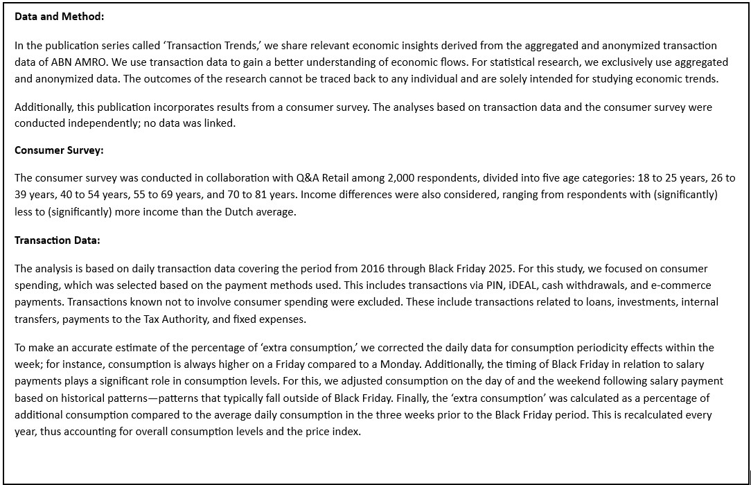 For this research, we use a consumer survey and anonymized and aggregated transaction data from ABN AMRO. We analyze how much additional consumer spending households make during the period around Black Friday in the years 2016 through 2024. For 2025, we have included the most recent data up to and including Black Friday.